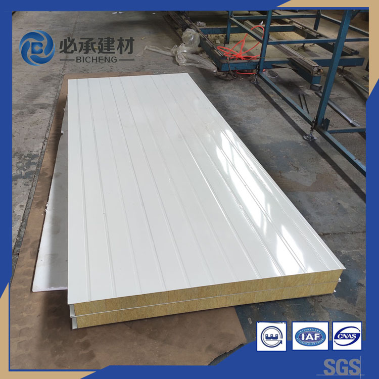 巖棉塊之間和巖棉與上、下層鋼板之間通過高強度發泡劑粘接而形成整體,精良的生產工藝保證了高密度的巖棉隔熱體與金屬板內壁之間能產生極強的粘著力,從而使巖棉夾芯板具有很好的剛度。